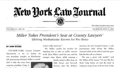 Miller is profiled in the New York Law Journal upon his induction as President of the New York County Lawyers' Association.